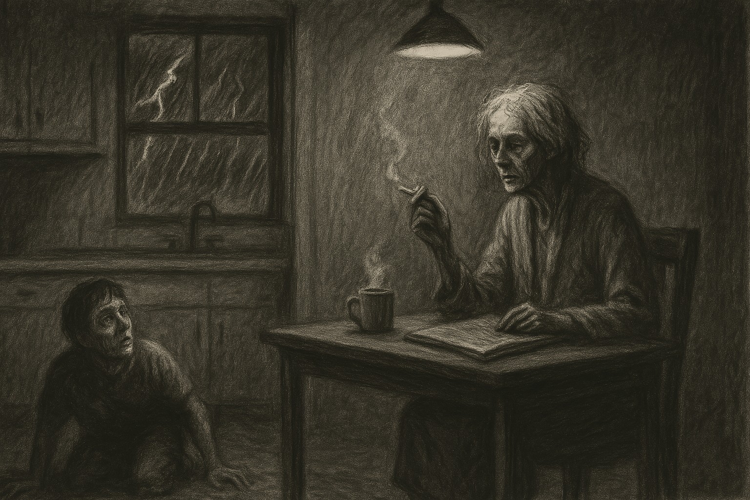 "Of course it's mom, who the hell else would it be?" she cackled. She turned back on the light, and there before me stood the seemingly rotting corpse of my recently deceased mother. She stood there, coffee and newspaper in hand in the nightgown she wore constantly since I was eight.